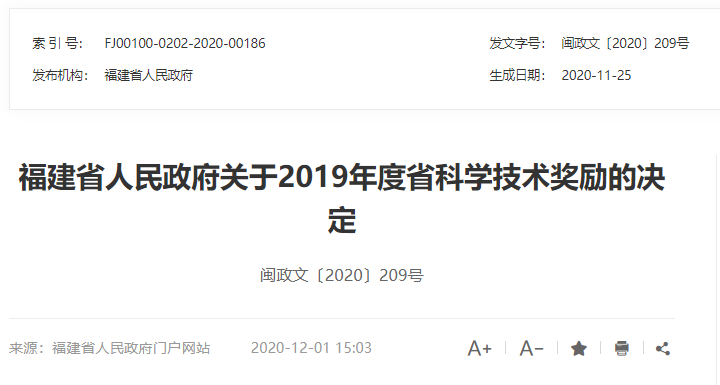 为营造有利于创新创业创造良好发展环境,鼓励科技成果转移转化,经省委研究,省政府决定对2019年度在科学技术进步活动中作出重要贡献的科学技术人员和组织给予奖励,并于近日在省政府网站发布了《福建省人民政府关于2019年度省科学技术奖励的决定》。