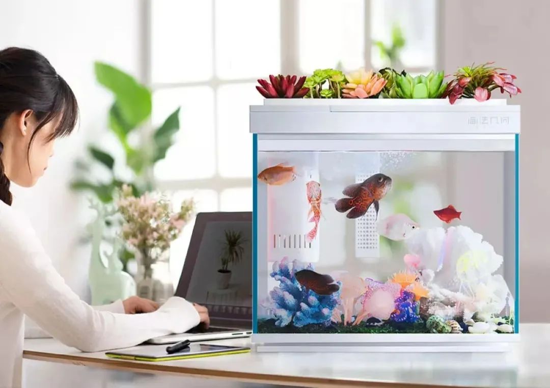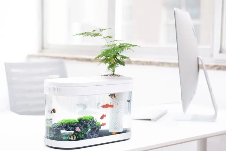 其次是美观性改造。画法几何的鱼缸,将灯光、水泵、过滤器等配件一体集成,用户无需再单独购买,对小白用户很友好,买回家安装就可以使用;并在上面添置了培育植物的空间,既可以养鱼,也可以种花草。