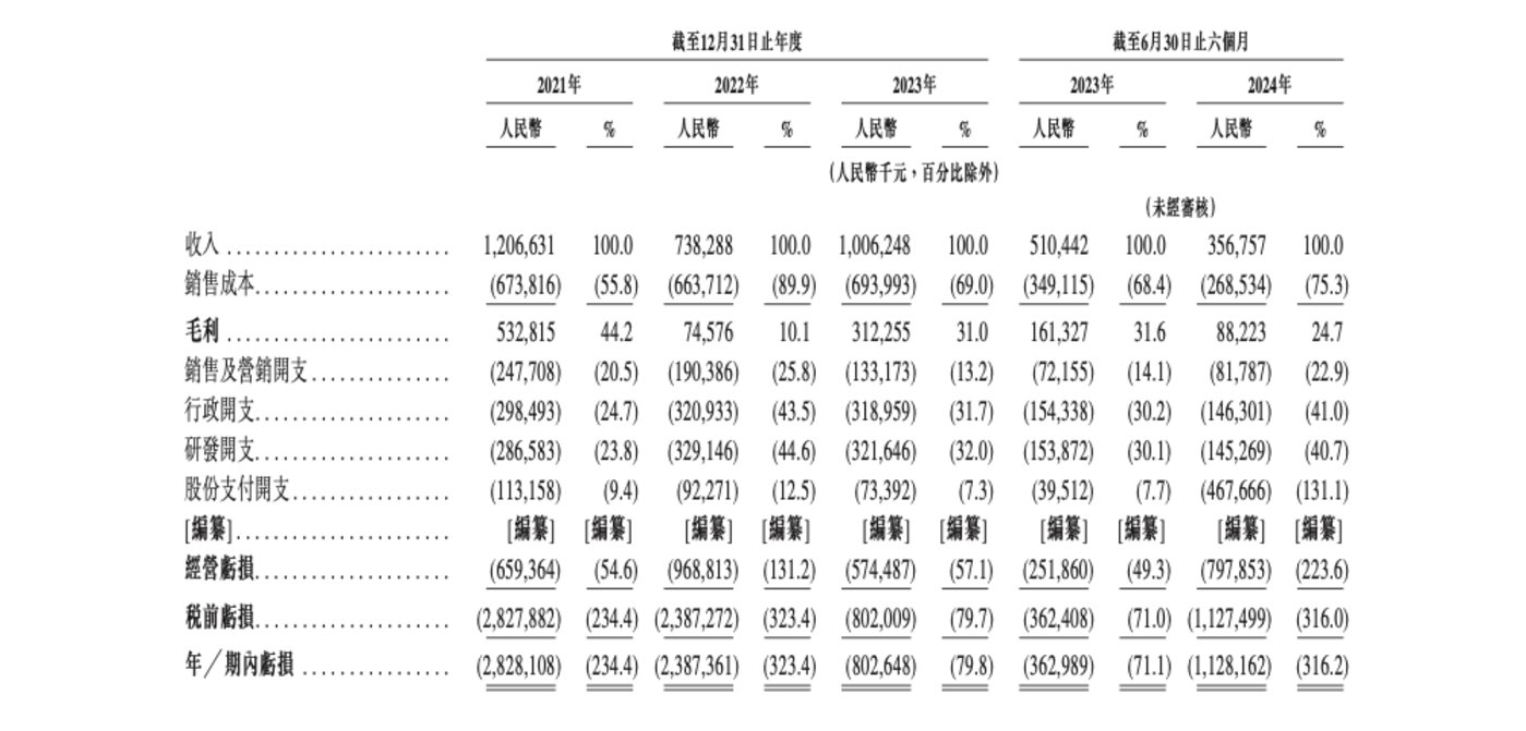 报告期内,特斯联的收入分别约为12.07亿、7.38亿、10.06亿、3.57亿;毛利分别约为5.33亿、7457.6万、3.12亿、8822.3万元,毛利率分别为44.2%、10.1%、31.0%、24.7%;期内亏损分别约为28.28亿、23.87亿、8.03亿、11.28亿元;经调整净亏损(非国际财务报告准则计量)分别约为6.39亿、9.83亿、6.00亿、3.56亿元。
