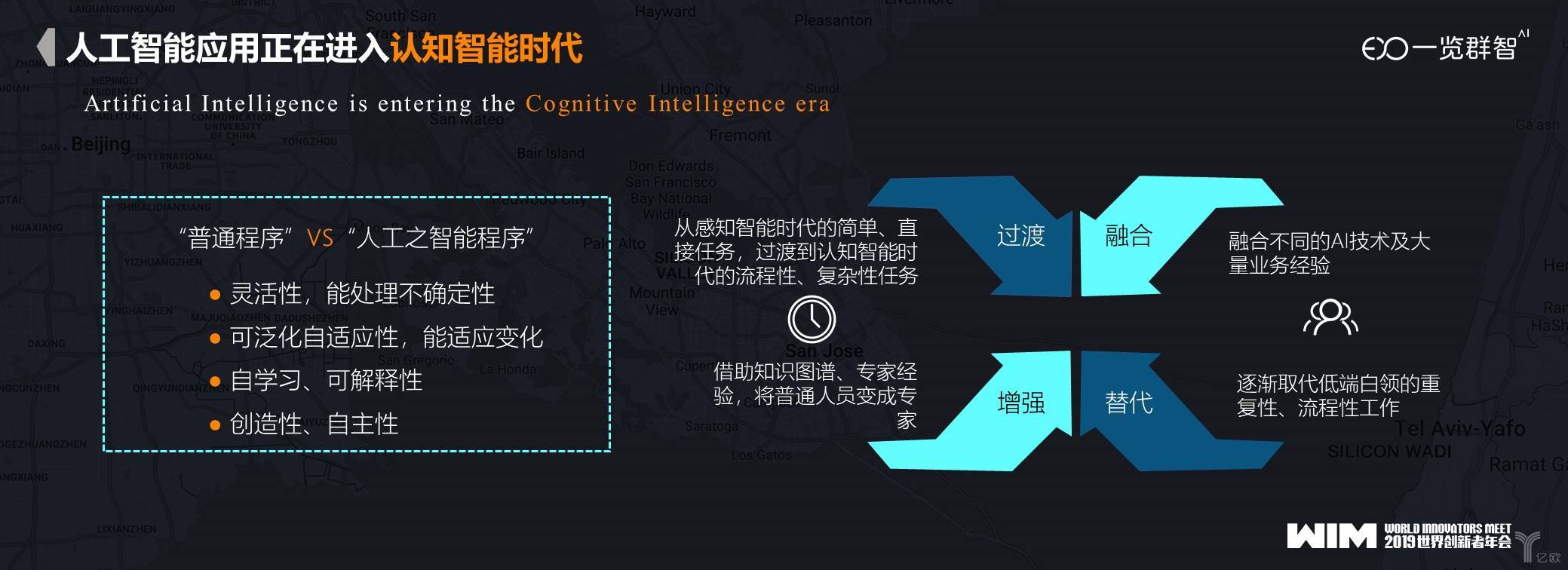 第一是过渡,从感知智能时代的简单、直接任务,过渡到认知智能时代流程性、复杂性的任务。第二是融合,现阶段的人工智能技术大部分是单点,比如视觉对视觉,语音对语音、自然语言对自然语言。但到认知智能时代,人工智能应该像人一样能够处理多模态的问题,例如能把视觉语音信号处理后,结合人的推理分析,最终来解决问题。第三是RPA包括API,用人工智能逐渐取代低端的、重复性和流程性的工作。第四是借用大数据、自然语言处理及知识图谱的发展,沉淀专家经验,让普通人也能完成一些中等专家水平的事情。在未来五年,这会是一个比较大的商业机会。
