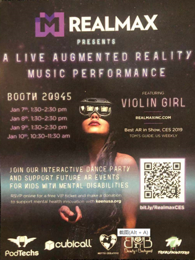 Realmax的AR世界位于:LVCC South Hall-20945展位,美妙的小提琴AR场景秀一定会让现场的小伙伴感受科技的幸福。
