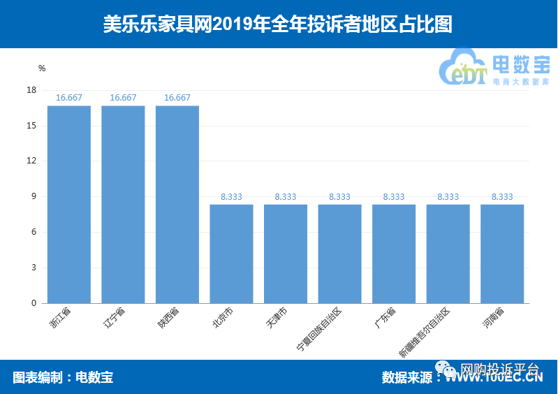 据“电数宝”显示,2019年度投诉“美乐乐家具网”的用户主要集中地为浙江省、辽宁省、山西省、北京市、天津市、宁夏回族自治区、广东省、新疆维吾尔自治区、河南省。