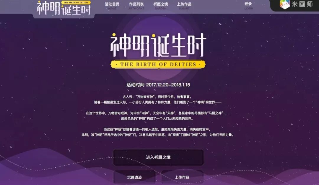 2017年12月又开办了“神明诞生时”征稿活动,活动开办26日,参与作品达660幅,参与画师有494人,微博话题阅读量超过1000万。在2018年,米画师也会尝试更多的题材和玩法来举办不少于两届的征稿活动。