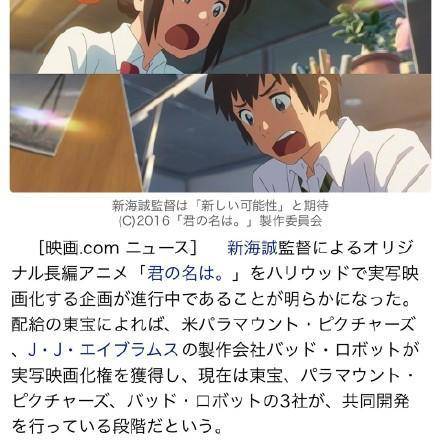 9月28日,据日媒官方消息,新海诚《你的名字。》改编权已被派拉蒙和坏机器人制片公司买下,两家公司将联手日本东宝株式会社把这部风靡全球的动画电影翻拍成好莱坞真人版。