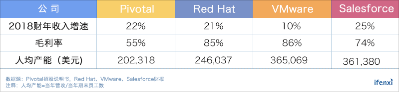 将Pivotal人均产能同Red Hat、VMware和Salesforce进行对比,Pivotal与它们仍有一定差距。