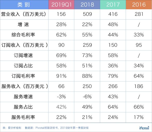 与业务结构相对应,Pivotal收入分为两部分,订阅和服务。订阅收入来自PCF平台,按年订阅,合同期限多为1-3年;服务收入来自Labs和平台实施交付服务。