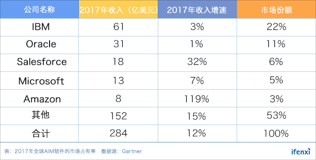 2017年,全球AIM软件市场规模增长12%,达到284.4亿美元,预计2018年将以更快地速度增长,此后增速将放缓,到2022年将趋于5%。