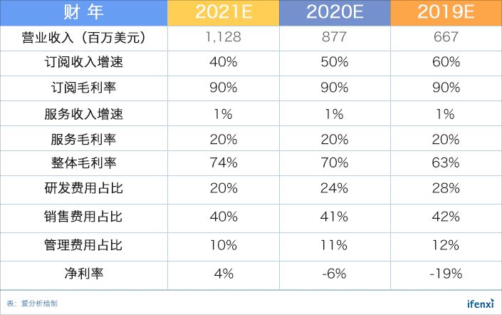 其中,爱分析预计服务收入增速年均为1%,订阅毛利率和服务毛利率趋于稳定,分别为90%和20%,研发费用占比趋于20%,销售费用占比将趋于40%,管理费用占比将趋于10%。