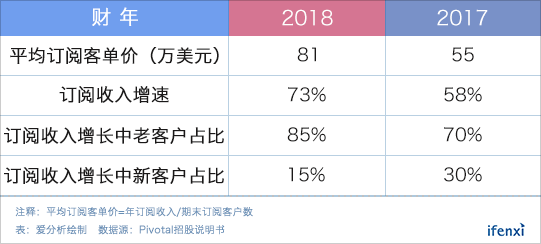 Pivotal老客户订阅收入的复购率在150%以上,贡献了2018财年85%的订阅收入增长,使得平均订阅客单价增长47%,达到81万美元。