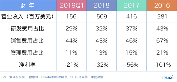 虽然Pivotal尚未实现盈利,不过随着收入增长,老客户订阅扩展的增加,可以看到经营费用占比不断降低,亏损逐渐减小。