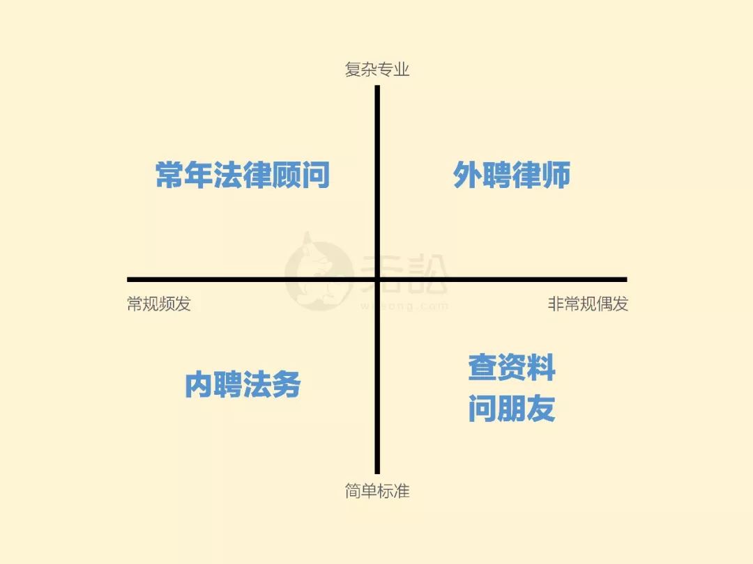 总之,聘请律师或法务的基本原则是实用。即便早期确实不需要,也至少要有一个懂法律的朋友,帮助你解决一些拿不准的问题。事实上,很多企业老板在早期都拥有一位这样的朋友帮他们持续渡过难关。下图是一个供大家参考的判断方法: