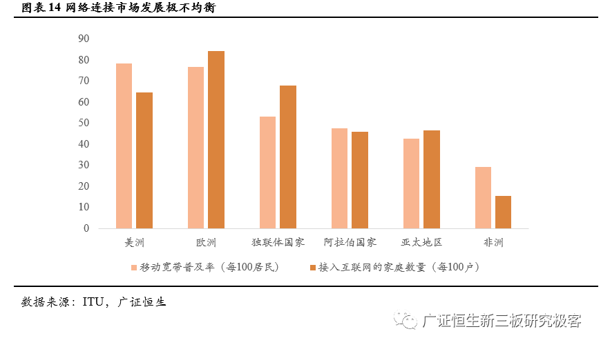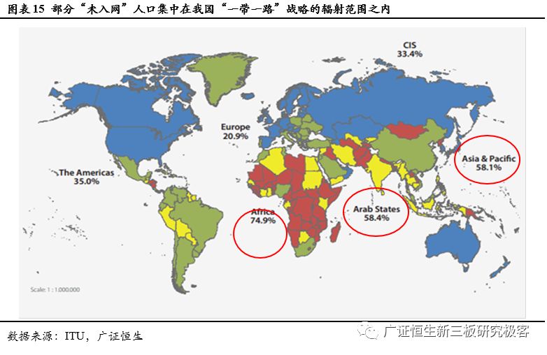 “一带一路”沿途国家光通信产业发展潜力巨大。根据ITU的数据,全球网络连接区域市场发展极不均衡。全球连接互联网的家庭数量占家庭总数的1/2,而美洲地区超过2/3的家庭已连接互联网。全球近十亿的家庭已经连接宽带,其中仅有不发达国家2000万户。在移动通信方面,非洲地区的移动网络接入率仅为欧洲和美洲地区的三分之一,仅达29.3。