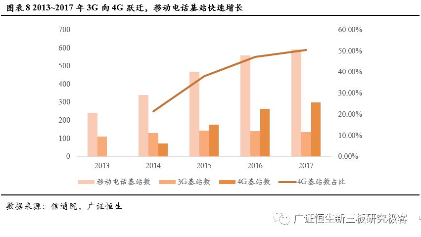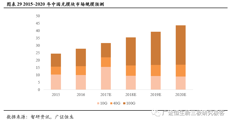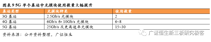 另一方面,5G时代单个基站中光器件/光模块的使用量也将大大提升。一般一个3G基站需要两个光模块;一个4G基站建设需要用到6~8个光模块。与4G技术相比,5G的数据传输速率是4G的10~100倍,假设在光模块速率保持不变的情况下,单个5G基站所使用的光器件/光模块数量将是单个4G基站的3~4倍。