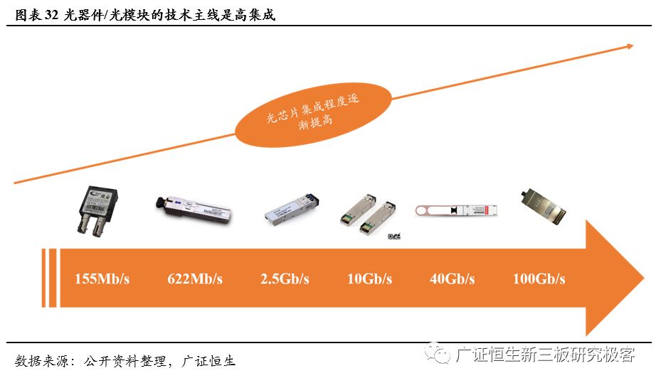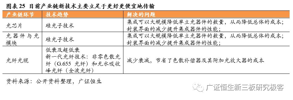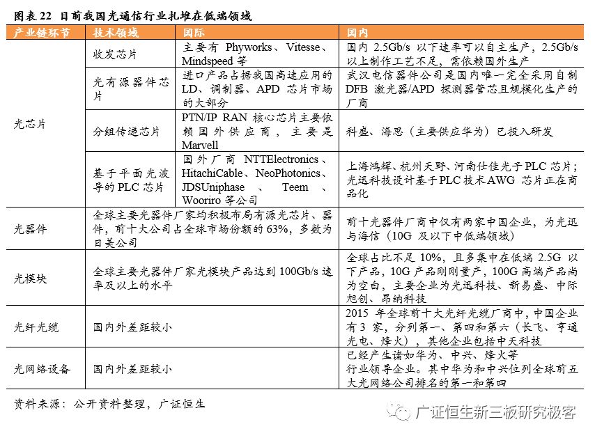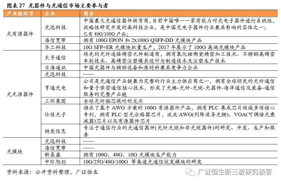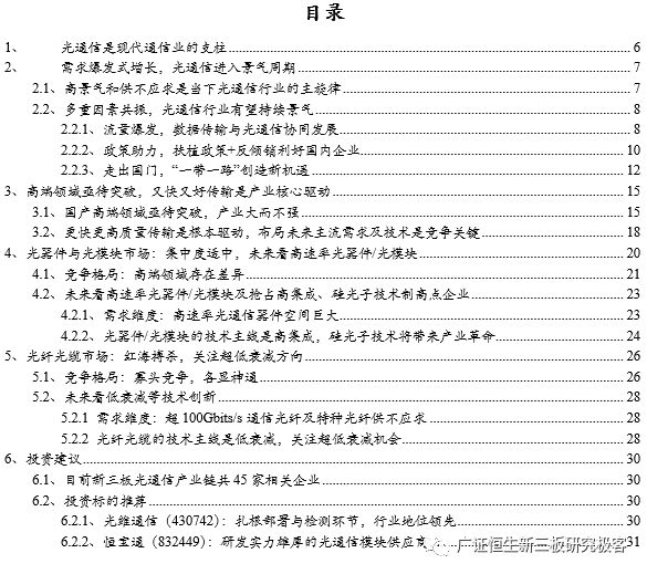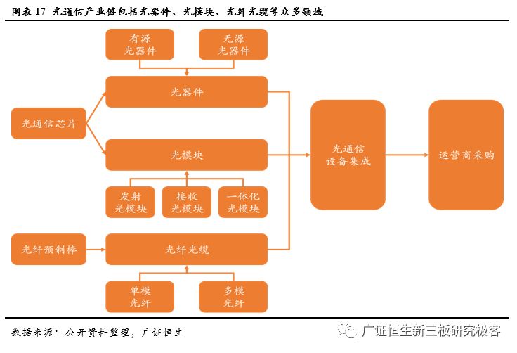 从市场需求及技术跃迁两大维度出发,我们认为光芯片、高端光器件与光模块、高端光纤光缆均大有可为,由于目前光芯片领域新三板企业较少,本文重点分析光器件与光模块、光纤光缆两条子产业链。