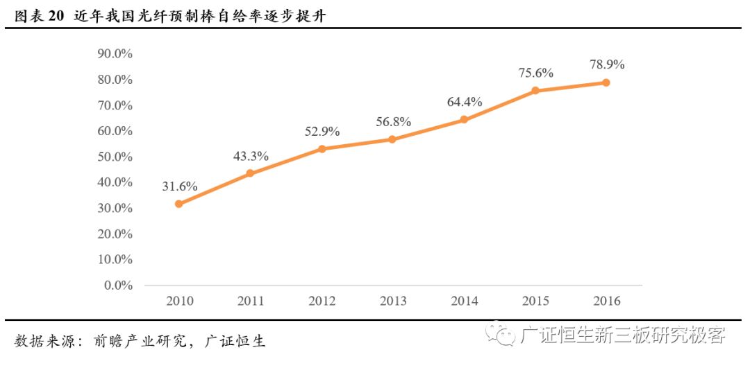 2012年日本大地震后,光纤预制棒短时间内供货紧缺,中国光纤企业受到冲击,纷纷加大投入光纤预制棒的技术革新,提升产能。根据前瞻产业研究的数据,2010年,中国光纤预制棒的自给率仅为31.6%,意味着我国光纤光缆行业中70%左右的企业完全依赖进口光纤预制棒;随着时间的推移,我国光纤预制棒的自给率逐年提升,到2016年底已经接近80%。