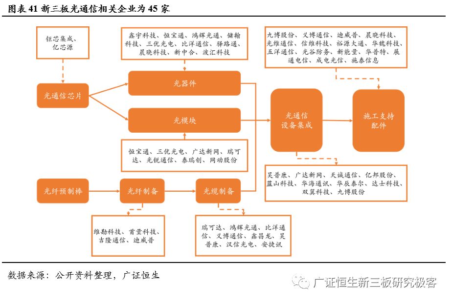 新三板企业中主营业务覆盖光通信产业链环节的企业共45家,考虑细分市场、需求及技术三大维度,建议关注光维通信(430742)、恒宝通(832449)等企业