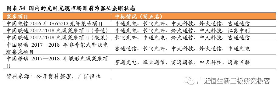 中国的光纤光缆市场是典型的寡头竞争市场。目前业内已经形成五巨头分组鼎立的格局,分别是长飞光纤、亨通光电、烽火通信、富通通信和中天科技。我国光纤光缆生产商最主要的客户是三大运营商,每年产能的85%以上被三大运营商所消化。纵观历次运营商采购中标结果,这五家企业几乎占据了每次集采招标份额的前五名位置。