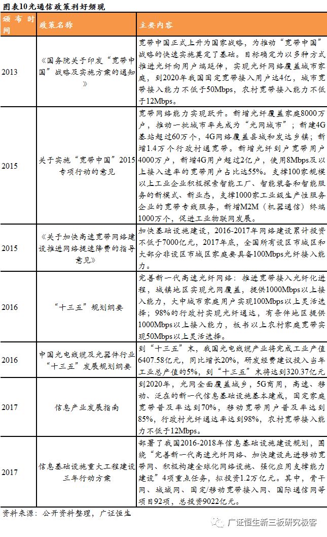 政策利好频现,刺激光通信产业投资火热态势。长期以来,国家高度重视光通信产业发展,出台多项政策助推产业发展。2013年,国家提出“宽带中国”战略,提出发展目标:到2020年,宽带网络全面覆盖城乡,固定宽带家庭普及率达到70%。随后,提速降费、三网融合等政策的出台均提及对光通信产业的发展指导意见,彰显国家层面对通信基础设施的重视。