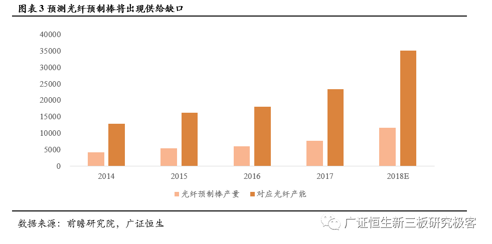 受光纤预制棒产能释放周期限制,短期出现供货缺口。当前我国光纤生产商纷纷积极扩产,投资新光棒生产项目,以应对本轮需求爆发。但由于核心环节光纤预制棒扩产产能释放周期较长,短期内预计仍将出现光纤需求的供货缺口。以1吨光纤预制棒可拉制3万芯公里光纤计算,前瞻研究数据显示我国目前光纤预制棒产能为7800吨,仅能满足23400万芯公里光纤拉制的需求,与2018光纤预测集采量3.5亿芯公里仍有一定差距。