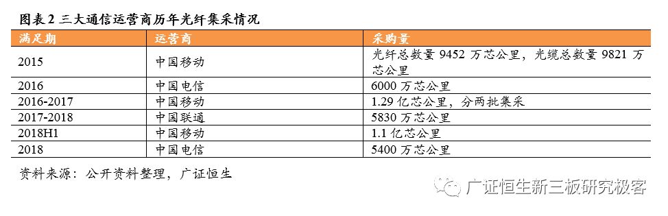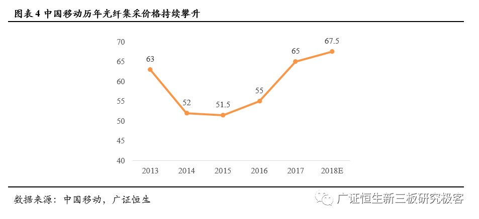 下游需求强劲,2018年三大运营商采购量大。由于中国移动的 " 鲶鱼效应 ",家庭宽带的竞争越发激烈,电信运营商陆续启动光纤光缆集采。亨通光电在 CRU 大会上预测,2018 年中国市场需求有望达到 3.5 亿芯公里,同比增长约 15-20%,其中中国移动采购量预测为2亿芯公里,中国电信超过5000万芯公里,中国联通预测集采4000万芯公里,其余需求源于广电及其他小型需求商,下游需求依旧强劲。