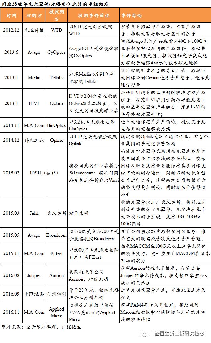 光器件厂商收购上游光芯片生产商,以垂直整合的方式降低成本,完善解决方案:光器件厂商M/A-Com收购光芯片公司BinOptics,获得上游光芯片生产能力,降低其主营产品生产成本和上市周期。