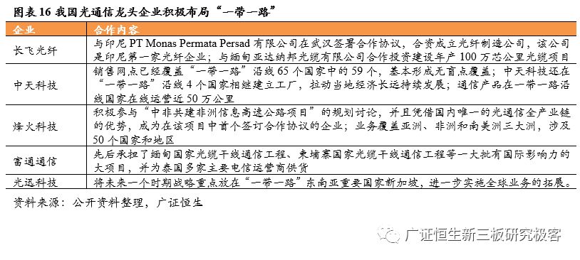 “一带一路”开辟通信新大陆。自“一带一路”提出以来,中国通信行业积极参与“一带一路”沿线国家和地区的基础设施建设。光通信作为通信行业主干力量,在“一带一路”的进程中始终走在前列。据中国电信预计,未来五年内“一带一路”将为电信产业链创造100至200亿美元的商机,光通信设施建设将成为“一带一路”信息化建设的优先行动。通信设备、光纤光缆、数据中心等产业链各环节将充分受益。
