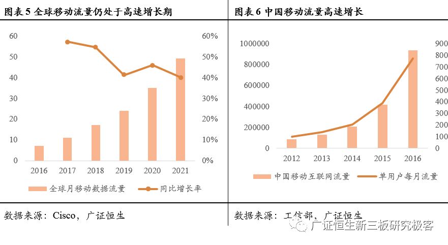 流量持续爆发式增长对光通信高景气形成基本面支撑。作为流量时代的基础设施,光通信需求与通信流量增长密切相关。目前我国通信能力整体处于全球74位,更高速可靠的数据传输需求仍然是消费终端的主要需求。而中国国内,自4G网络全面推广普及后,五年间国内移动互联网总流量以60.49%的复合增长率高速增长。单用户每月流量也增长迅猛,由2012年的98.2Mb/月上涨到2016年的772Mb/月,复合增长率达51.04%。Cisco预测在未来五年间,全球月移动数据流量将以每年34%的复合增长率增长,并在2021年达到49EB/月,接近2017年数据的5倍。