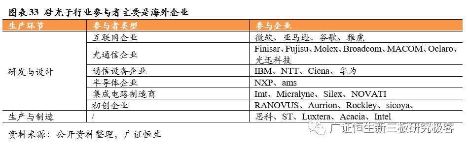 抓紧加码硅光子,巨头布局等待下一轮放量期。硅光子技术主要涉及“设计-制造-封装”三大生产环节,从产业链来看,包括原材料供应商(晶圆厂等)、设计厂商、制造厂商、封装厂商、系统集成商等,当前商用产品较少,整个产业还没有形成稳定的竞争格局。在这一领域,光通信巨头均投入力量进行研究开发,布局等待技术突破和大规模商用的来临。
