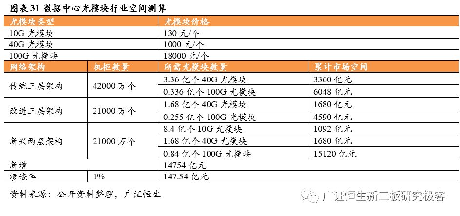 根据IDC的统计,全球数据中心数量在2017年达到840万座,主要分布于美国、欧洲、日本、中国等地区。保守假设平均一个数据中心具有5个机柜,则全球数据中心的机柜数量为840(万座)*5=4200(万个)。假设未来全球数据中心50%的机柜采用改进三层架构,另外一半机柜采用新型的两层架构,未来每年数据中心改造渗透1%,新增市场空间约为147.54亿元。