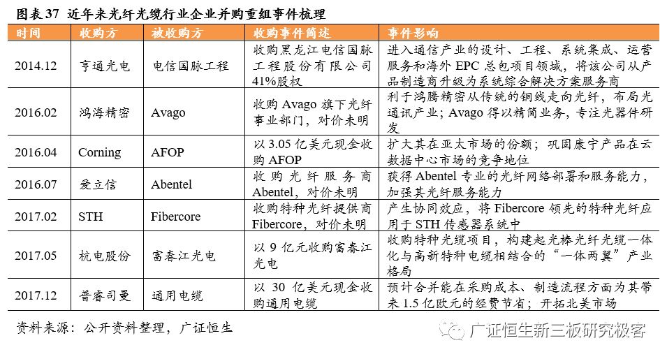 相比并购活跃的光器件/光模块子产业链,光纤光缆领域近年来的并购重组发生较少。光纤光缆市场处于寡头竞争的格局较为明朗,相比于光器件/光模块行业其定价供销话语权较大,产业更加成熟。主要的并购重组目的如下: