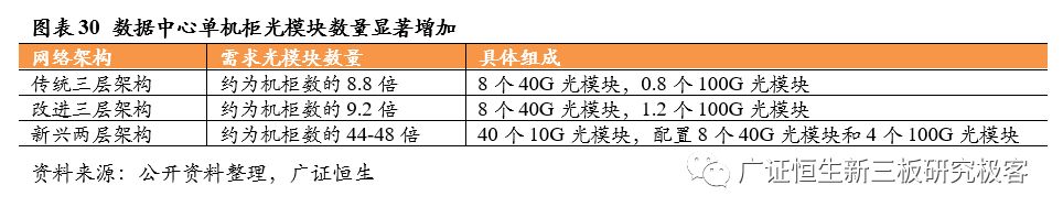 假设每年1%数据中心架构升级,未来每年数据中心光模块新增市场空间约为147.54亿元。随着网络架构的不断演进,单机柜需要配置的光模块数量显著增加。目前新兴的数据中心网络架构方式有扁平化的趋势,主要为解决数据中心内部(东西向)数据流动,东西向数据主要由云计算、云迁移、IaaS 虚拟配置、分布式计算以及大数据(数据量较大,存储与不同服务器)等应用驱动。