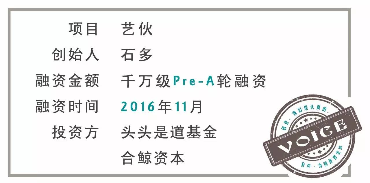 2016年11月,艺伙在线艺术教育平台获得千万级投资,由头头是道基金领投,合鲸资本跟投。
